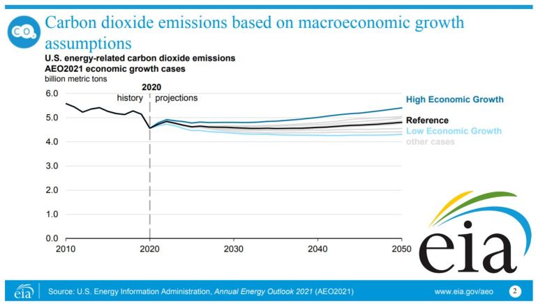 The US government’s Energy Information Administration (EIA) Annual Report projects United States CO2 emissions, from all energy sources, to remain approximately constant over the next 30 years, as shown below. In other words, according to the US gov’t, the US is not reducing CO2 emissions toward zero. This is based on current gov’t policy. If policy changed slightly, the below curve would change too, yet only slightly. This model is helpful to lawmakers, since it enables them to see the effects of possible policy changes.