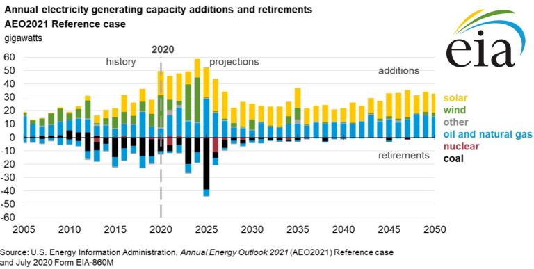 EIA is not estimating exponential growth from solar and wind power over the next 30 years. Instead, over 30 years, solar is expected to increase from 3% to 20% of total electricity, and wind power is expect increase from 8% to 14%, as shown below. Wind construction (green bars below) stop after 2024 due to an expired wind tax credit. If this credit is extended, one can expect more wind, however not enough to solve our problems.