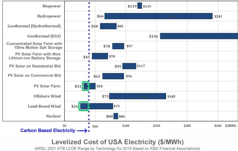 The following graph shows the cost to generate electricity from different sources, without emitting CO2, in $/MWh units, according to NREL’s 2021 USA ATB Model.