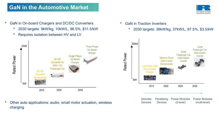 Ricardo is working in the field of wide-bandgap (WBG) semiconductors to expand the electrification program with both silicon carbide and GaN. Rodriguez pointed out that Tesla was the first to employ SiC instead of IGBTs, and many companies are heading the same way with WBG solutions, including GaN, with the promise of increasing efficiency and reducing the size and weight of power converters.
