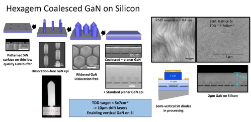 Figure 3 shows the new technology developed by Hexagem on a very thin 100-nm silicon wafer. By modeling this surface, Björk said it is possible to grow defect-free GaN pillars. “A method has been developed to fuse these pillars into a planar layer,” he said. “We’re working on developing this process on other semiconductors.”
