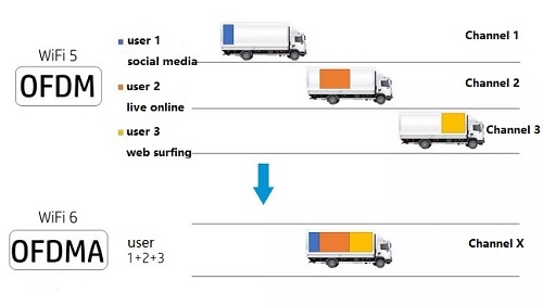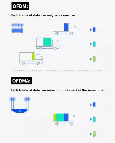 WiFi 5 uses OFDM (Orthogonal Frequency Division Multiplexing) technology, while WiFi 6 borrows OFDMA used in cellular networks. Multiple terminals can transmit in parallel at the same time without waiting in line and competing with each other, thereby improving efficiency and reducing latency. For example, it turns out that only one carrier can transmit a data packet in a time period. After using OFDMA, it is equivalent to multiple carriers that can transmit multiple data packets at the same time in a time period.