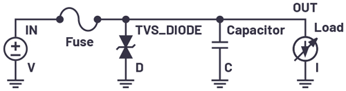 Figure 3 shows the simple implementation of a TVS diode to protect a downstream circuit. Under normal operating conditions, the TVS is high impedance and the input voltage simply passes to the output. When an overvoltage condition occurs at the input, the TVS becomes conductive and responds by shunting the excess energy to ground (GND), clamping the voltage seen by the downstream load. The rail voltage rises above the typical operation value but is clamped to a value at a safe level for any downstream circuitry.