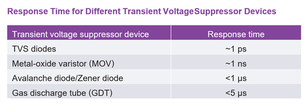 Although these feature a range of constructions and characteristics, they all operate in a similar manner: Shunting the excess current when the voltage exceeds the device threshold. A TVS clamps the voltage at the output to the rated level within a very short period of time. A TVS diode, for example, can respond in as low as picoseconds’ time, while a gas discharge tube (GDT) may take a few microseconds to respond but is able to handle much larger surges.