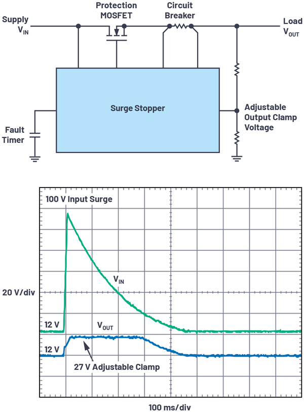Figure5 shows a simplified schematic of a surge-stopper implementation, along with the results of a 100-V input surge on a nominal 12-V rail. The output of the surge stopper circuit is clamped to 27 V for the duration of the surge event. Some surge stoppers also monitor for overcurrent conditions using a series sense resistor (the circuit breaker in Figure 5)and adjust the gate of the N-channel MOSFET to limit the current presented to the output load.