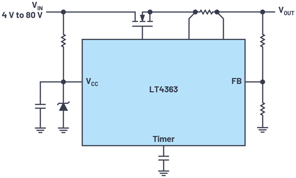 The rate of change of the timer voltage varies with the voltage across the MOSFET—that is, a shorter timer for larger voltages and a longer timer for smaller voltages. This useful feature enables the device to ride through short overvoltage events, allowing downstream components to remain operational while protecting the MOSFET from damage by longer-lasting overvoltage events. Some devices feature a retry function, enabling the device to turn on the output again after a cool-down period.