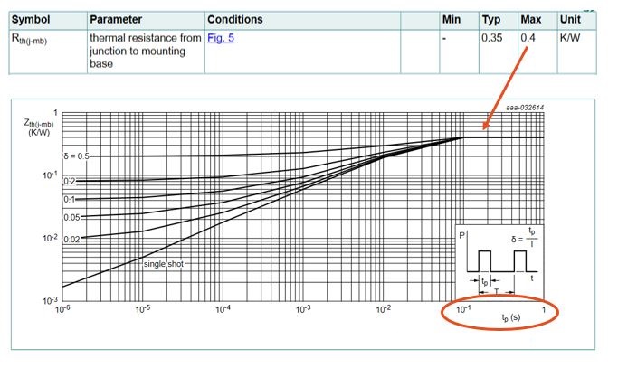 The key parameters needed to calculate this maximum power allowance are the thermal impedance between the die and the mounting base Zth(j-mb) (Figure 1) and thermal resistance between the die and the mounting base Rth(j-mb). Rth(j-mb) is the thermal resistance that refers to the thermal response that has reached steady-state conditions (also referred to as DC conditions).