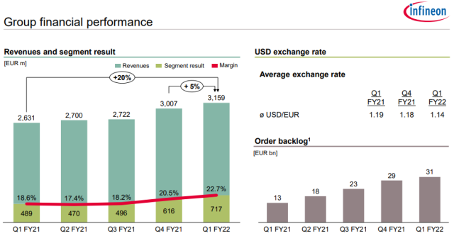 For the first quarter of fiscal year 2022, ending December 31, 2021, Infineon reported slightly better-than-expected revenue of €3.159 billion, up 5% on a sequential basis and 20% on an annual basis. The profit for the period amounted to €457 million, down from €464 million in the previous three-month period.