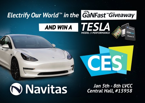 At CES, Navitas will showcase its GaNFast power ICs, integrating GaN power and drive plus protection and control to deliver simple, small, fast, and efficient performance. According to Oliver, the company will also reveal how GaNFast technology has been supercharged with power-upgraded, thermally enhanced versions of the proven 650-/800-V GaNFast platform, now further upgraded to 700/800 V, to address the challenges of next-generation solar, data center, and EV fast-charging applications. In addition to the technologies and solutions on display, Navitas is also launching a competition to win a Tesla Model 3 Performance, worth over $60,000.