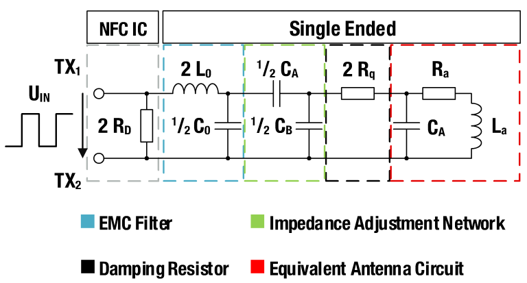 Let’s begin with the structure of a typical NFC output circuit. An NFC IC usually has a differential output and an impedance of 50 Ω between the output pins TX1 and TX2. These pins are connected to a circuit consisting of a filter network, a matching circuit, attenuation resistors and an NFC antenna. The output of the NFC IC is differential to provide resistance to electromagnetic interference. A typical differential NFC output circuit is shown in Figure 4.
