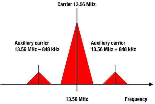 The cut-off frequency fC must be higher than the upper subcarrier, which for the highest possible NFC data rate (848 kbit/s) is 13.56 MHz 848 kHz = 14.4 MHz. To illustrate the necessity of the filter, Figure 6 shows an NFC load modulation spectrum with carrier and subcarriers.
