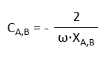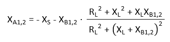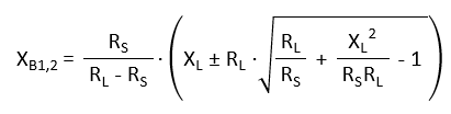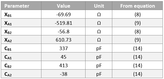 The matching reactances XB and XA can be calculated directly with equations (8) and (9). For RS, the real part of the EMC network must be used, which is 165.82 Ω. For the imaginary part of the source reactance XS, the imaginary part of the EMC filter must be used, which is -45.46 Ω. For RL and XL, the real and imaginary parts of the antenna network must be integrated, namely 1.87 Ω and 62.53 Ω. The resulting matching reactances XA and XB can be converted into the corresponding differential matching capacitors CA and CB as follows: