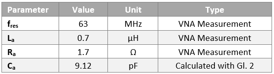 For the NFC antenna WE-WPCC WPT/NFC (item 760308101312), the following parameters were determined by measurement and calculation: