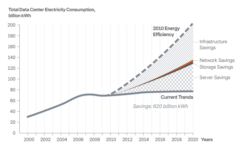 In the U.S., data center power consumption is expected to continue growing at a rate of 4% to 5% annually until 2022 and beyond. This is far below the rate of growth in data center compute capacity and is a testimonial to the effectiveness of industry efforts to reduce power footprints while improving the efficiency of power supplies. While improvements in efficiency since 2010 have had a dramatic impact on power usage (Figure 1), the need for continued innovation is clear.