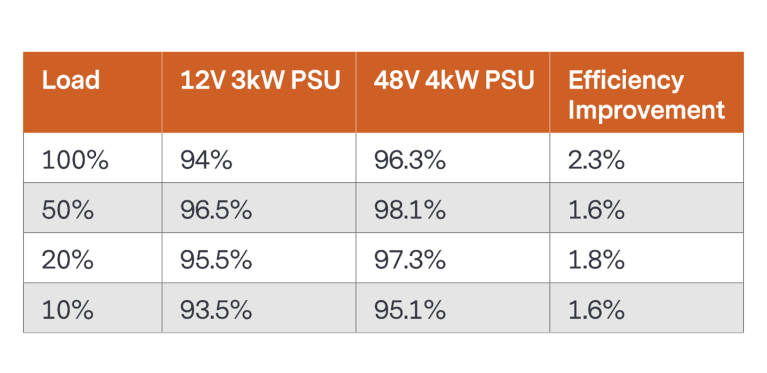 Conversion efficiency is just one element of the equation in determining power use in a data center. Other factors favoring 48 V instead of 12 V are that current draw for the same power level is reduced by 4× and distribution losses are 16× lower. This equates to better thermal performance and therefore reduced cooling requirements, as well as the ability to reduce the size of power bus bars, all of which factor into overall power use to operate the data center.