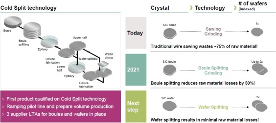 The first step, which is already productive now on Infineon sites, has been achieved through the innovative Cold Split technology, which can process crystal material efficiently and with minimal waste of resources. Today, traditional wire sawing wastes up to 75% of raw material, while the already-deployed SiC boule splitting is able to reduce raw material losses by 50%. In the near future, Infineon will use this technology to split entire SiC wafers, thus doubling the number of chips out of one wafer, as shown in Figure 1.